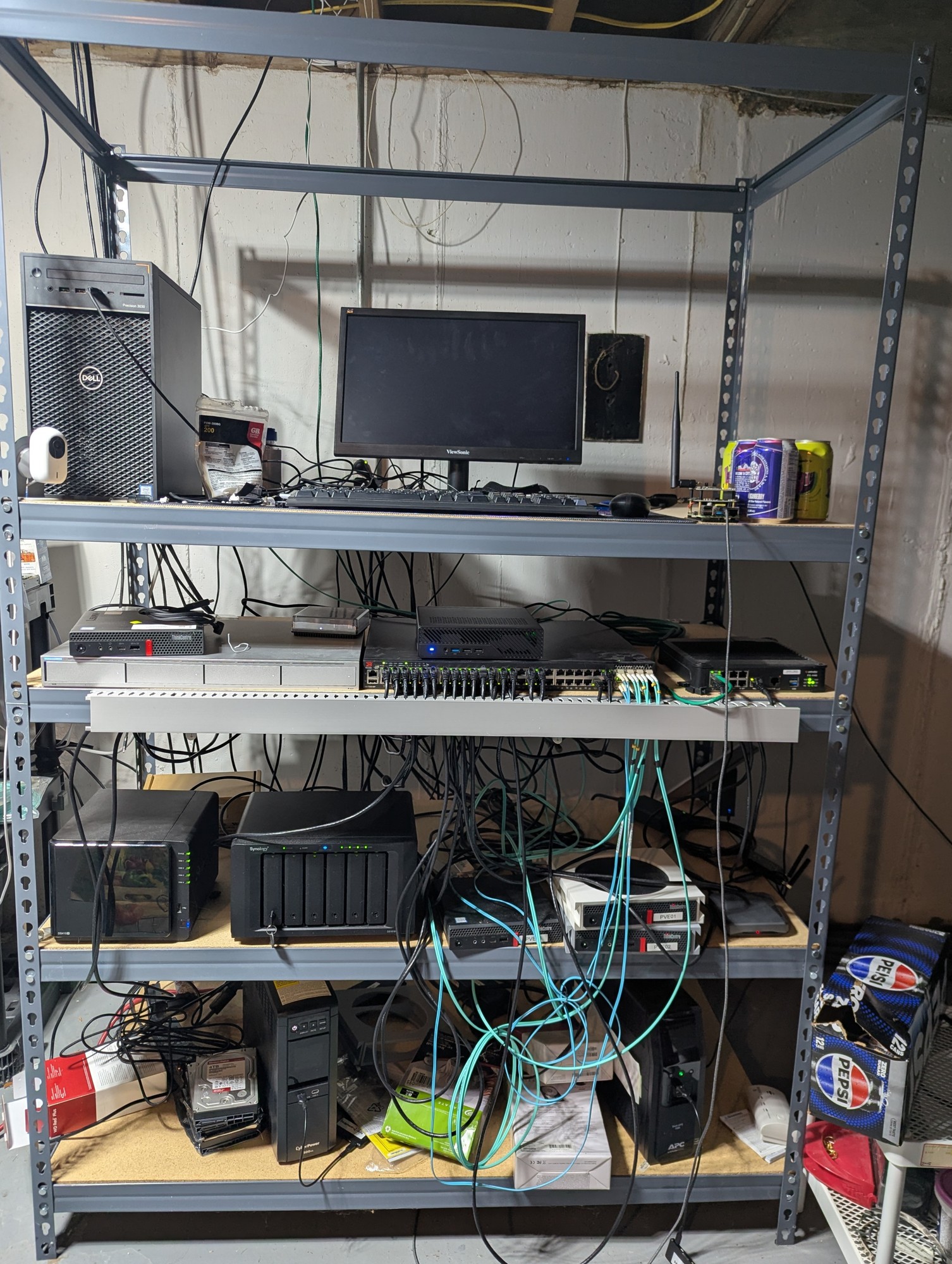 Behind me are some 30 guitars a few older than I am, a couple Korg controllers, a DAW, various and sundry computer/music gear. Top left monitor on the wall monitors my pFsense box, the one to the right is for surveillance cams. Sorry I didn't have the presence of mind to switch the monitor to the Linux box as I don't discriminate between OS platforms.
